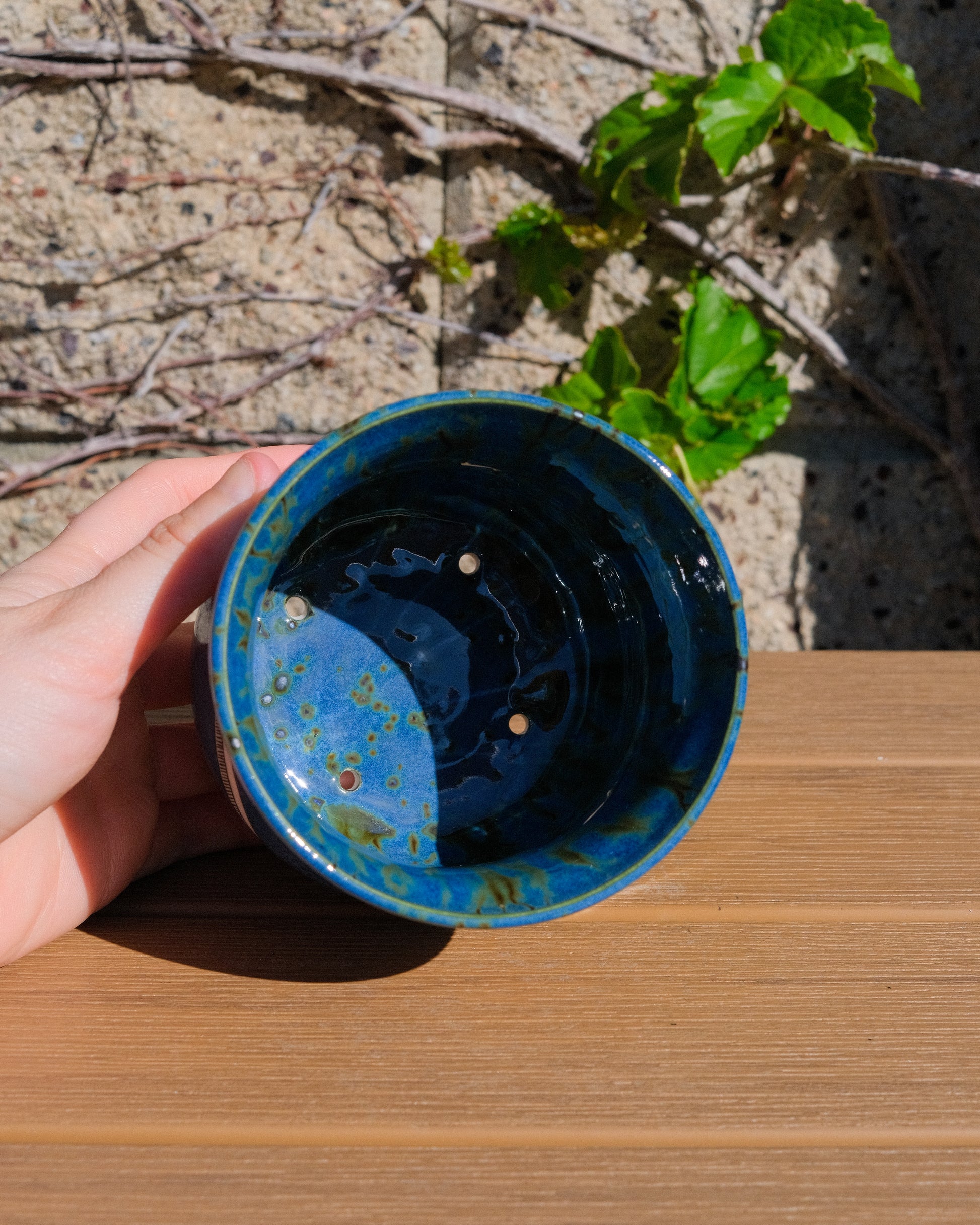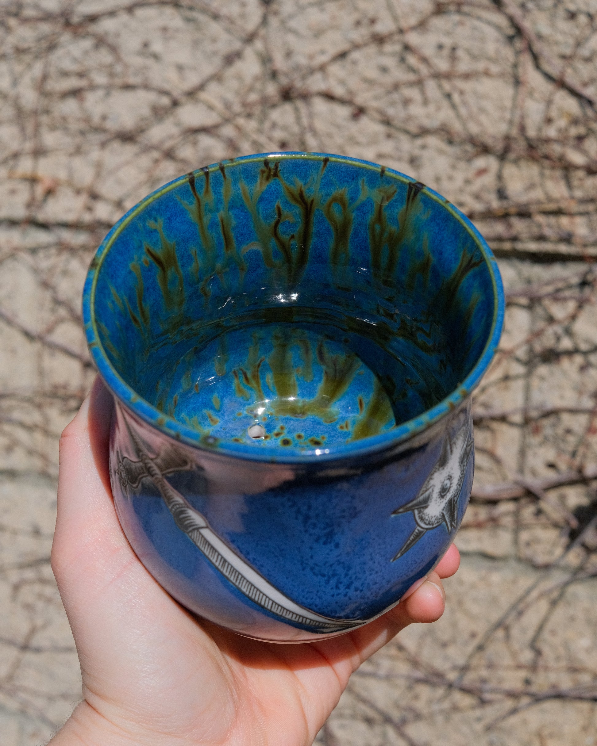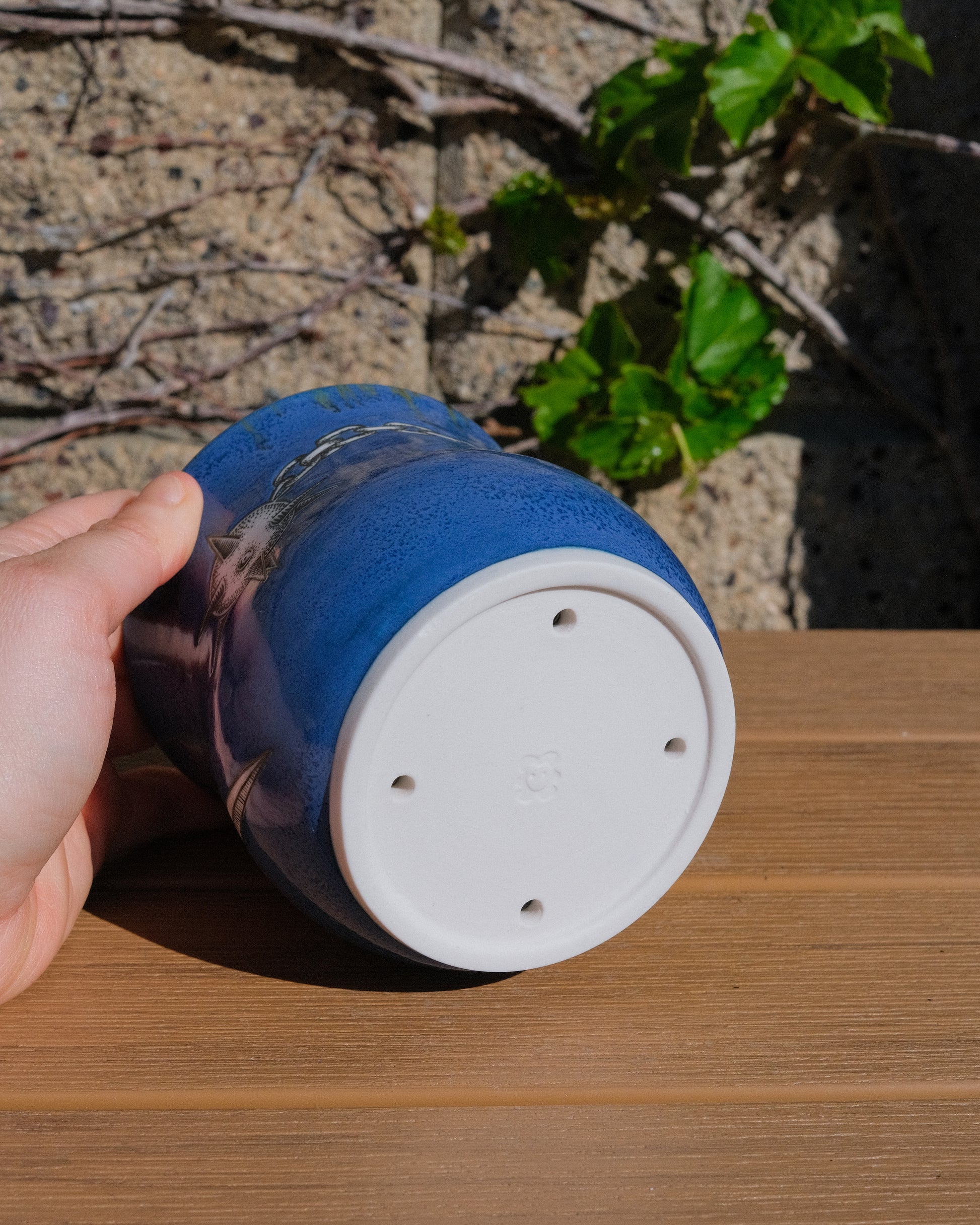 A white porcelain planter with a mottled blue glaze on the outside. The glaze on the inside is a speckled blue glaze with flowing brown speckles. The illustrated area is raw porcelain painted with underglaze. The bottom of the planter has four small drainage holes to prevent root rot.
