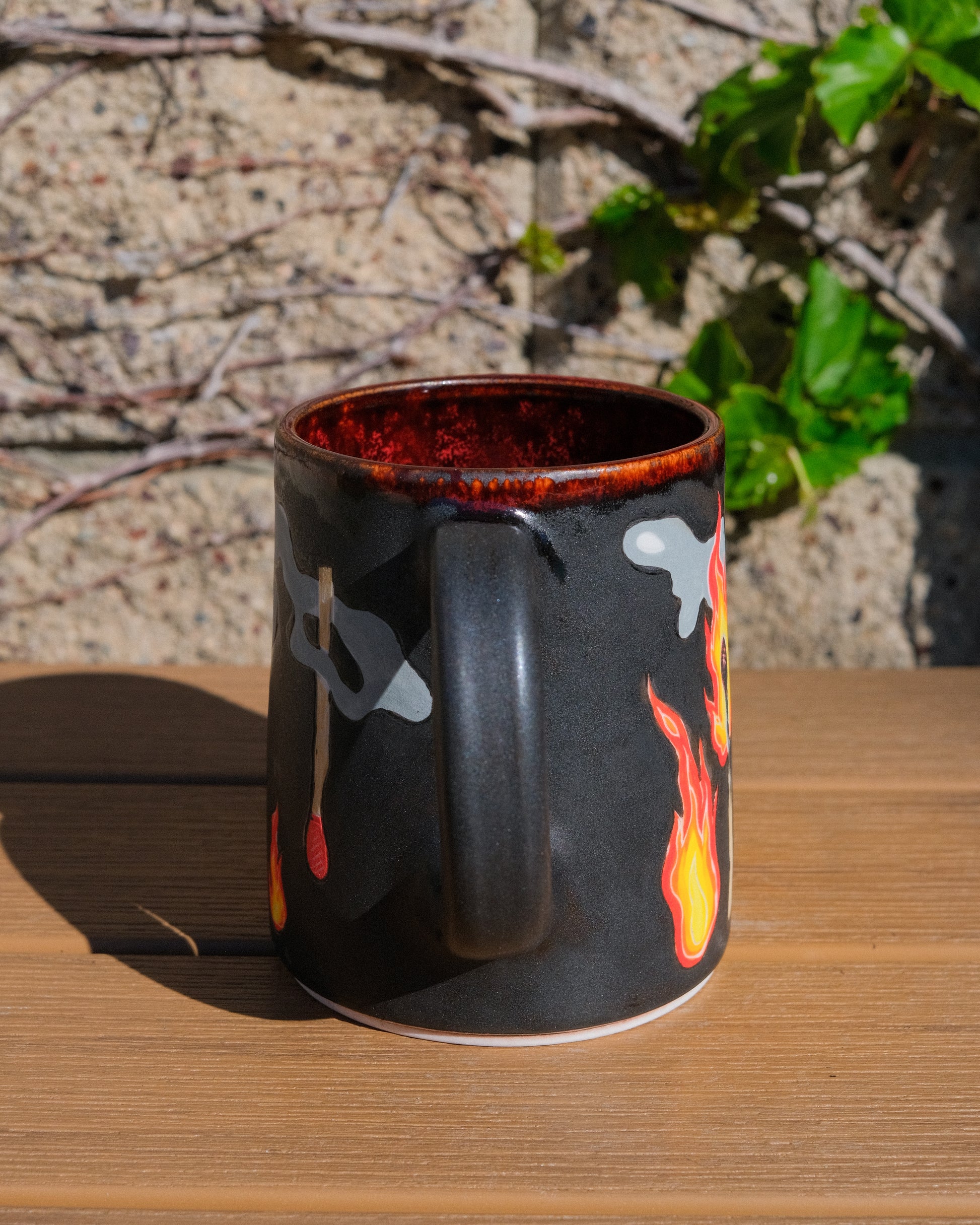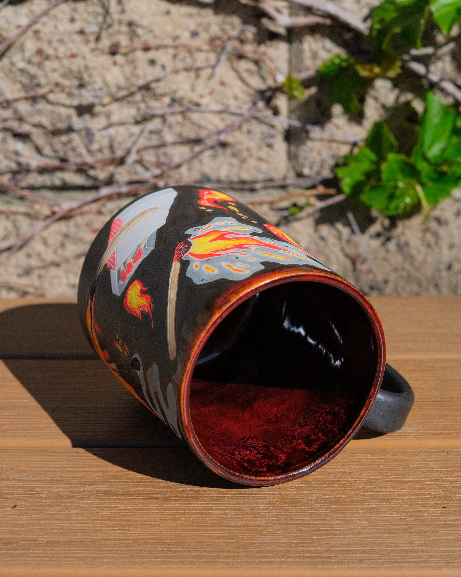 A white porcelain mug with a semi matte black glaze on the outside. Some areas are glossy where the glaze was applied thick. The glaze on the inside is a fiery mottled red. The illustrated area is raw porcelain painted with underglaze and carved with intricate detail.
